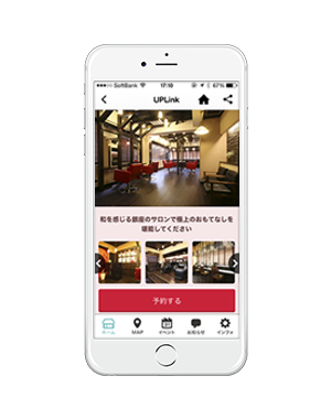 ボタンをタップすると電話番号が表示されて電話がかけられます。店舗で運用中の予約システムにつなぎ込むこともでき、予約の問い合わせをアプリからスムーズに誘導できます。